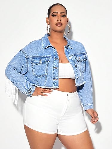 Why Choose WDIRARA Women's Plus Size Fringe Trim Raw Hem Long Sleeve Button Front Short Denim Jacket?