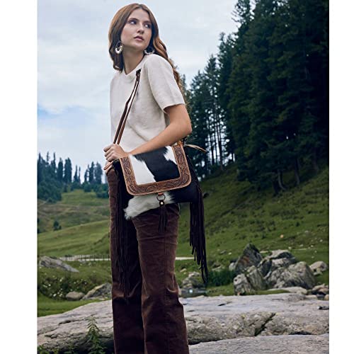 Western Leather Shoulder Bag for Women - Upcycled Cotton Hairon Crossbody Bag with Tassel Alina