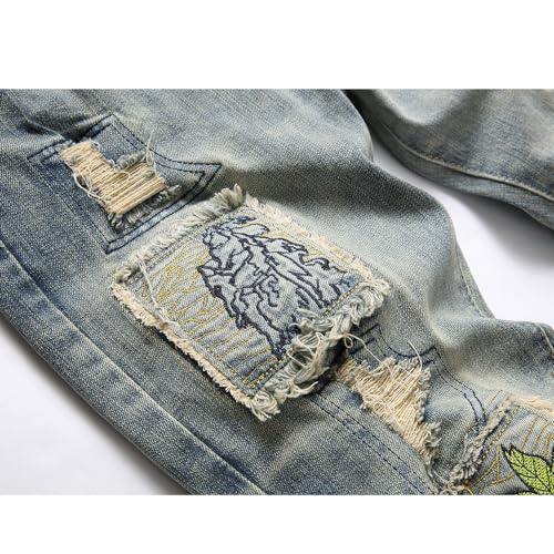 Fabric type: 75%Cotton+20%Polyester+5%SpandexCare instructions: Machine WashOrigin: ImportedClosure type: ZipperHIGH QUALITY.The fabric with 6*10 Yarn of Long fibre is more durable and not easy to change shape.SLIM FIT. Designed with a slim fit and straight leg, these jeans sit at the natural waist for a slimmer, more tailored look, making it chic to wear.FASHION TREND DESIGN. Nice cutting in good version style, variety of colors and styles for you to choose, personalized and unique design, hipster street style , make you look more handsome, to be the coolest guy when walking on the street.STRETCH COMFORT. These distressed jeans are constructed from a perfect blend of stretch-cotton fabric that help maximize freedom of movement, ensures comfortable to wear all day.CLASSIC 5-POCKET STYLING. Zipper fly, button closure; 2 Front Pockets, 1 Watch Pocket, 2 Back Pockets. Five deep pockets easy to store keys, watch, mobile phones, wallets Etc.SIZE NOTE: We recommend you to check our size chart carefully before purchase. If you want tighter feeling,just choose the true size. if you want loose feeling or wide waist, please choose one size bigger.Professional production of fashion jeans like Destroyed graffiti ... for 20 yeas. Perfect for everyday use. excellent materials and excellent craftsmanship ensure long-lasting durability.