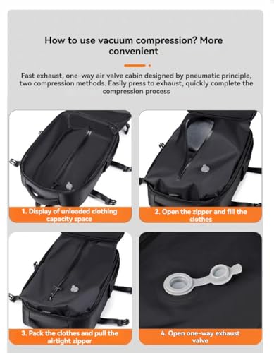 Innovative Vacuum Compression System: Saves 80% Storage Space: The Lunapack Backpack is equipped with an innovative airbag vacuum compression system that reduces clothing volume by 80%, eliminating bulk and maximizing packing efficiency. Paired with the included electric air pump, compression is quicker and more efficient, allowing you to fit more clothes in less space—perfect for extended trips.Capacity Equivalent to a 24 Suitcase: Flexible Expansion for All Needs Despite its compact design, the Lunapack Backpack offers capacity comparable to a 24 suitcase, expanding from 25L to 60L. Whether you need space for a week-long business trip, weekend getaway essentials, or hiking/trekking gear, it adapts to your needs without compromising on storage.Carry-On Size: Hassle-Free Boarding, No Extra FeesWorried about exceeding airline size limits? The Lunapack Backpack stays within carry-on dimensions at 18.11”×12”×7.8” (46cm×30cm×20cm), ensuring smooth boarding without extra baggage fees. Its large capacity never comes at the cost of convenience.Durable, Well-Made, and pleasant for Long Journeys: Crafted from high-density oxford fabric, the Lunapack Backpack is water-resistant and scratch-resistant, built to withstand travel wear and tear. It features premium SBS zippers for durability and smooth operation. The ergonomic back design with thick, ventilated padding reduces shoulder and neck strain, keeping you comfortable even during long treks.Multiple Compartments and Pockets: Organized Storage for Everything Stay organized with three spacious main compartments and multiple specialized pockets: a dry/wet separation pocket isolates damp clothes and odors; a padded laptop compartment securely holds a 17-inch device; side bottle pockets, multi-function pouches, and an anti-theft pocket for passports ensure every item has its place. Perfect for everyday use. excellent materials and excellent craftsmanship ensure long-lasting durability.
