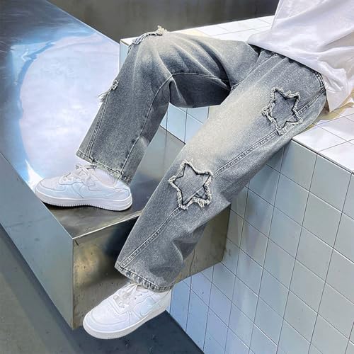 Boy's Pull On Jeans Cute Star Baggy Denim Pants Elastic Waist Straight Wide Leg Jeans for Teen Boys 8-14 Years
