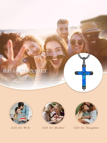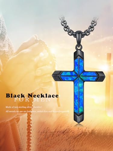 Material: Sterling SilverMetal type: Sterling SilverClasp type: LobsterChain type: RoloGem type: No GemstoneDesign Inspiration: The bold black cross, adorned with mesmerizing blue opal, symbolizes depth, intuition, and spiritual protection. The opal’s shimmering blue hues evoke the mysteries of the ocean and the cosmos, offering a sense of calm and inner strength to those who wear itMaterial: Crafted from 925 sterling silver and natural blue opal, this cross pendant is nickel-free, lead-free, cadmium-free, and hypoallergenic, ensuring comfort for even sensitive skin. The blue opal’s iridescent flashes add a dynamic, mystical touch, shifting in light for a captivating effectChristian Cross Necklace Size: Pendant dimensions: 40mm (1.57) x 29mm (1.14); Weight: 8.6g; Chain: 22+2 adjustable stainless steel chain with a secure lobster claspPerfect Gift Idea: Presented in an elegant gift box, this striking cross necklace is ideal for daily wear, special occasions, or as a meaningful gift for loved ones. A powerful symbol of protection and wisdom, it makes a thoughtful present for men and women alikeCustomer Satisfaction Guaranteed: If you have any questions or concerns, our team is happy to assist with exchanges or any issues, ensuring you’re completely satisfied with your purchase impeccable for everyday use. excellent materials and excellent craftsmanship ensure long-lasting durability.