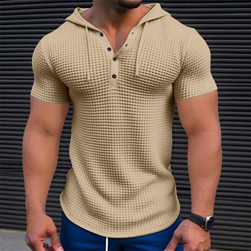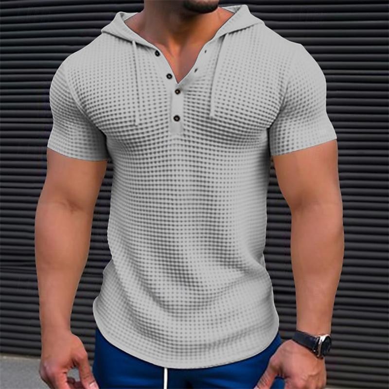 Highlights [Fabric] : Crafted with a textured waffle knit fabric, this men's short-sleeve shirt offers a contemporary flair and a lightweight feel, making it ideal for casual wear. The breathable cotton blend ensures comfort and ease of movement for all-day wear. [Fit] : Designed with a tailored fit, this shirt accentuates the upper body, providing a current and flattering silhouette that suits a range of body types. [Design Highlights] : Featuring a partial button-up front with four buttons, this shirt offers versatility in styling. The hood adds a sporty touch to the classic tee design, perfect for leisure activities. The solid color options provide a clean, modern look. [Occasions] : Suitable for summer outings, this hooded tee is perfect for street, casual, and outdoor occasions. It is an excellent choice for laid-back gatherings and daily wear, adding a chic yet relaxed vibe to any outfit. [Size Range] : Available in a range of sizes from S to XXXL, ensuring a fit for different body types. The shirt comes in several versatile colors, including khaki, green, white, and grey, allowing you to choose the perfect shade for your style. Perfect for everyday use. excellent materials and excellent craftsmanship ensure long-lasting durability.