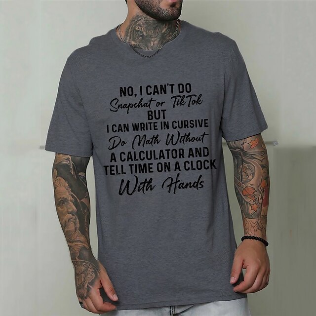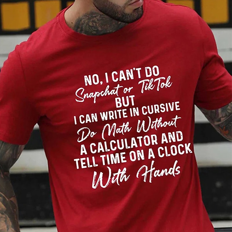 : Featuring a witty letter graphic that reads "No, I can't do Snapchat or TikTok but I can write in cursive, do math without a calculator, and tell time on a clock with hands," this T-shirt adds a playful and contemporary touch to any outfit. The bold black print stands out against the versatile color options, including White, Black, Navy Blue, Red, and Grey.