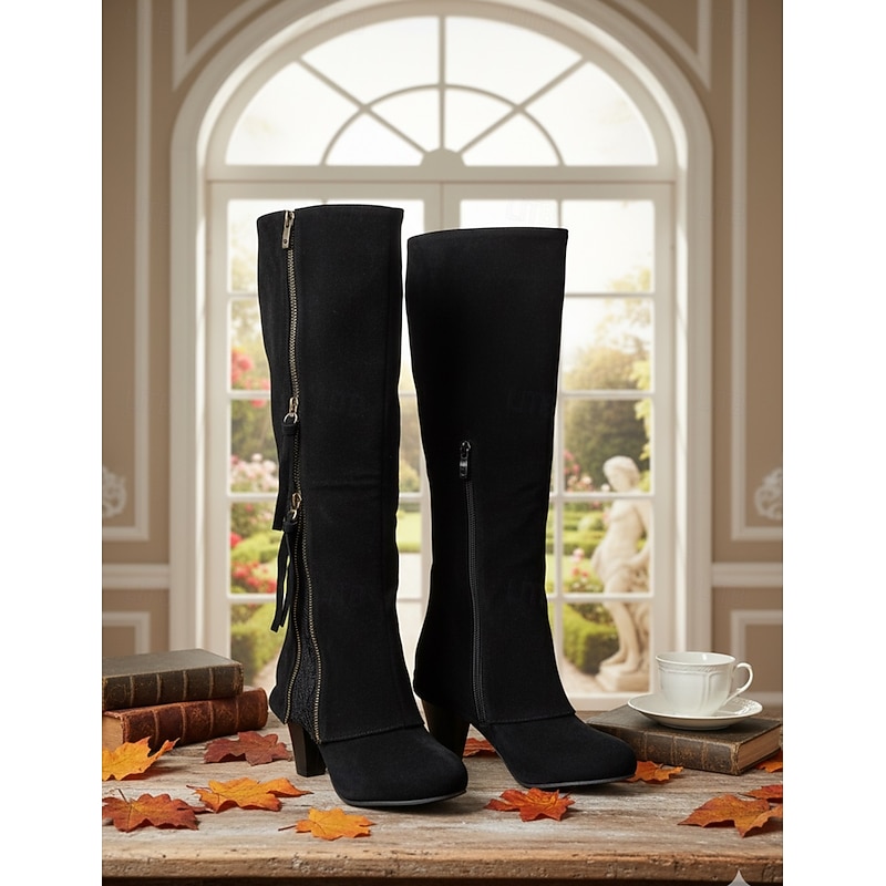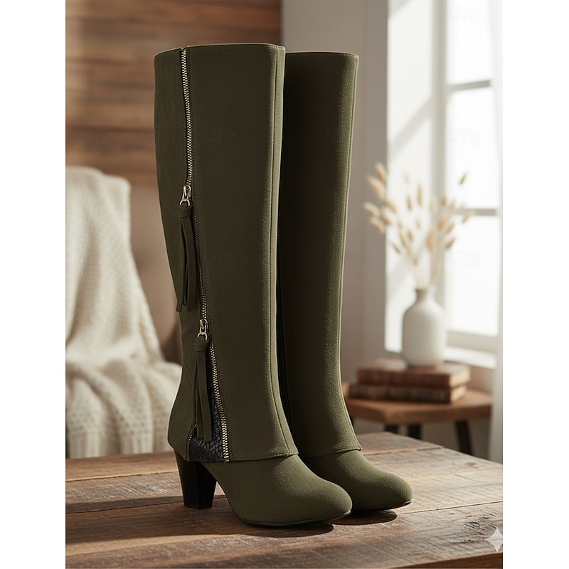 Highlights [Fabric and Material] : Crafted from a soft, suede-like PU material, these knee-high boots offer both comfort and sophistication suitable for fall and winter seasons. The interior is lined for warmth and added comfort. [Fit and Style] : Featuring a timeless round toe and a modest 1-2 inch cone heel, these boots provide a blend of classic and contemporary styles. Their slouchy design allows for effortless wear, while the durable construction ensures they withstand daily use. [Design Highlights] : These chic mid-calf boots are enhanced with a convenient side zipper and decorative lace detailing, adding an elegant and fashionable flair to the design. The solid earthy tones make them versatile enough to pair with a variety of outfits, from casual to semi-formal. [Occasions] : Perfect for daily activities, work settings, or outdoor adventures, these boots are well-suited for casual and country-style occasions. Their timeless elegance and comfort make them a great choice for the cooler months. [Size Range] : Available in a range of sizes from US6 to US10.5 (EU36 to EU42, UK4 to UK8.5), catering to a wide variety of foot sizes for women. Available colors include brown, black, light grey, and dark green to suit different style preferences.