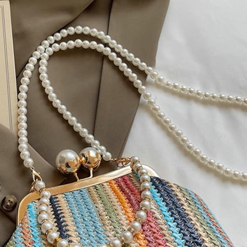 Straw Woven Shell Bag Women Kiss Lock Pearl Top Handle Handbag Summer Colorful Rainbow Striped Shoulder Tote