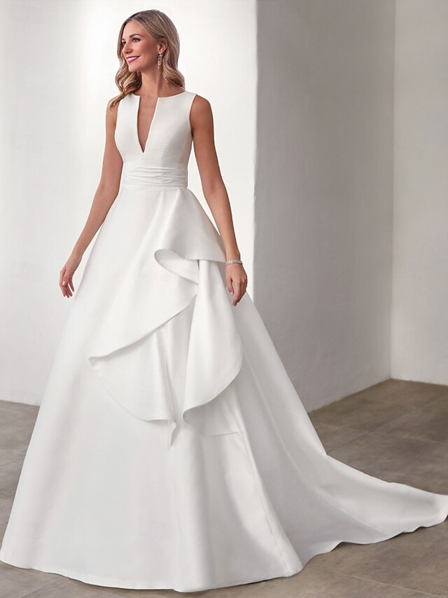 More information about Wedding Dresses A-Line V Neck Sleeveless Floor Length Satin Bridal Gowns With Appliques Solid Color
