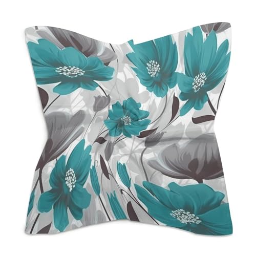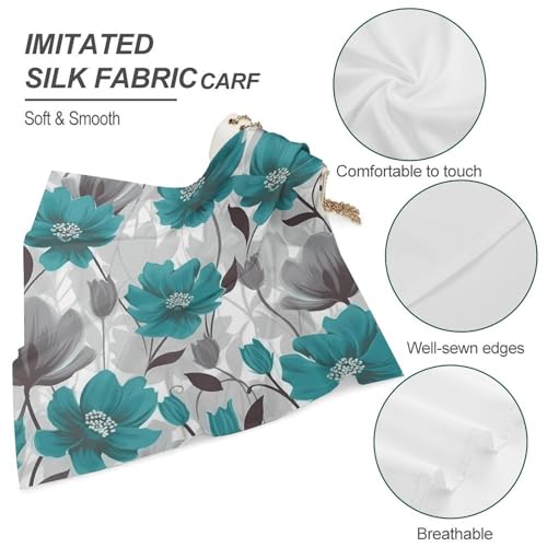 Teal Grey And White Floral 25 Inches Satin Head Scarf Lightweight Silk Hair Scarves gentle Silk Head Scarf for Women Large Satin Bandanas Square Headscarf Fashion Headband Neckerchief Neck Scarves Gift