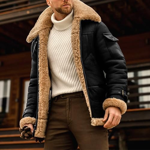 Vintage Fur Collar Sherpa Leather Coat for Men Winter snug Thicken Leather Jacket retro Motorcycle Bomber Overcoat