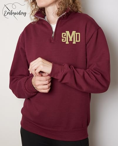 Fabric type: 50% Cotton, 50% PolyesterCare instructions: Machine WashClosure type: ZipperWeave type: RibCustom Embroidered Pullover Personalized Monogrammed Quarterzip Sweatshirt Pullover 995MRElegant Monogram Personalization: Customize your quarter-zip sweatshirt with beautifully monogrammed initials, adding a sophisticated and personal touch to your wardrobe.Perfect Gift Option: A monogrammed quarter-zip sweatshirt makes an ideal gift for friends, family, or colleagues, offering a thoughtful and personalized keepsake they'll cherish.Classic and Timeless Designs: Choose from a variety of classic monogram fonts and styles to create a polished and timeless look, perfect for both casual and professional settings.Please make sure all of the options you choose and the info you provide are accurate prior to purchasing our products. Perfect for everyday use. finest materials and excellent craftsmanship ensure long-lasting durability.