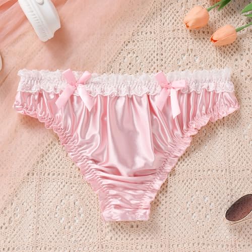 • Design: Shiny satin thong panties for men sissy lingerie underwear, mens silky underwear briefs satin g-string thongs, silk sissy thong panties for men, shiny glossy silk satin fabric, elastic waistband offers a comfy fit, with delicate lace trim, frilly ruffle sissy satin panties for male, with two cute mini bowk-nots at front waist, super cute and sissy.