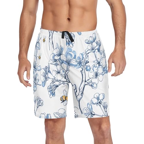Honeybee Cherry Blossom White Pajama Shorts for Men Lounge Pants Athletic Shorts Men'S Pajama Shorts with Pockets, S-XXL