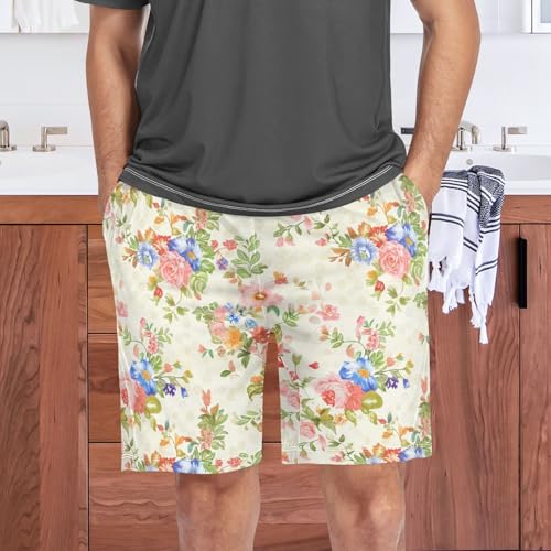 Floral Beige Pajama Shorts for Men Lounge Pants Sleep Lounge Pants Mens Shorts with Pockets, S-XXL