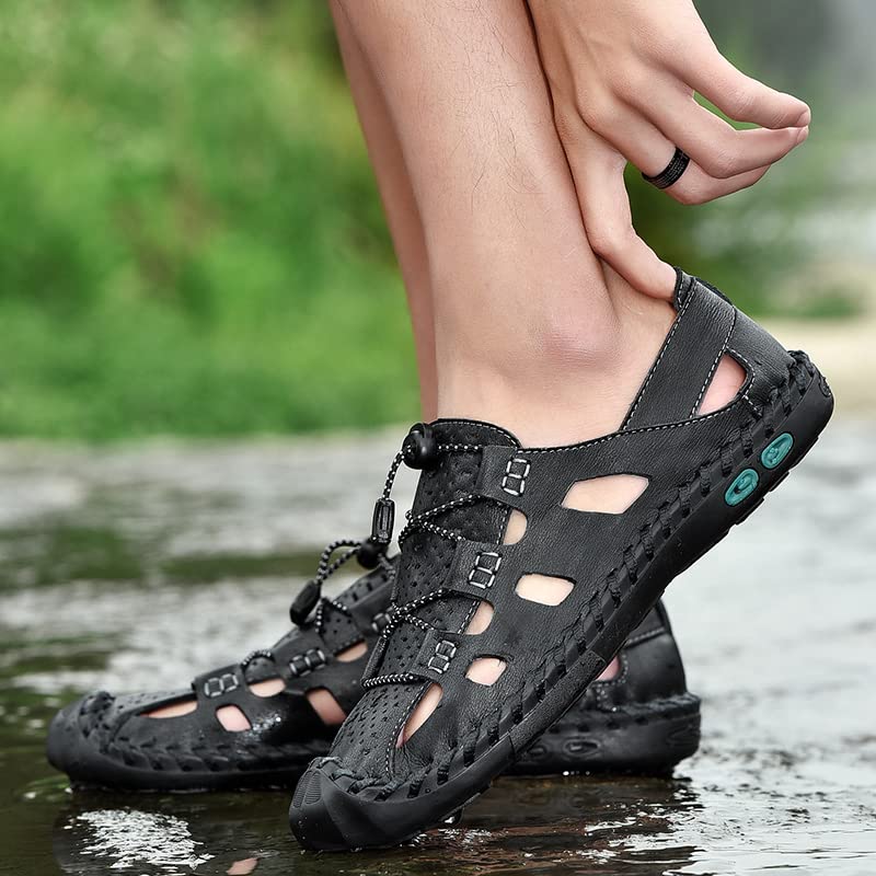 Sole material: RubberOuter material: LeatherClosure type: Slip OnWater resistance level: WaterproofComfortable Upper : Men's leather sandals are made of genuine leather, which is very durable, And these sandals are waterproof, so they’re suitable for use with water sports.Anti-collision Design: Extended round rubber closed-toe, providing greater protection for your toe ,ensuring safe outdoor activities.Adjustable switch: The elastic rope and buckle switch of casual sandals can help you adjust the size, customize the perfect pleasant fit for your feet.Anti slip outsole: Anti slip rubber outsole with excellent grip performance, allowing you to easily traverse rough roads and maintain balance on slippery surfaces.Suitable Occasion: Men's casual sandals are fashionable and versatile, which is the perfect choice for summer. put them on for beach walking, camping, driving, various outdoor activities, and daily wear. Perfect for everyday use. excellent materials and excellent craftsmanship ensure long-lasting durability.